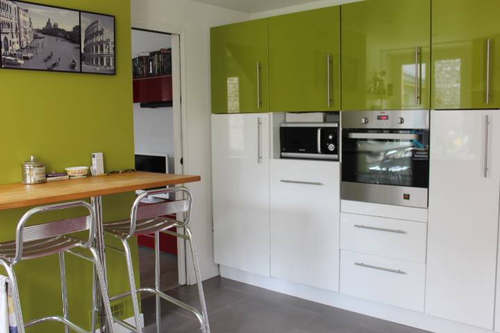 Une entrée avec placards, une cuisine aménagée et équipée, un séjour salon avec insert au gaz et une pièce technique.