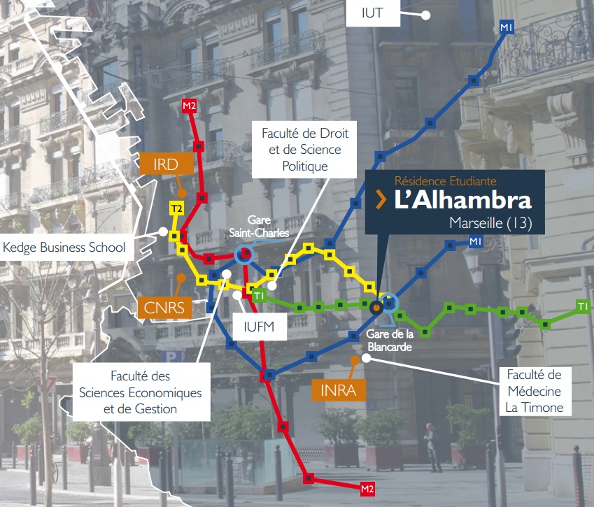 Marseille est la première ville universitaire de l'Académie d'Aix-Marseille avec plus de 50 000 étudiants dont 25 000 sur le campus de Marseille centre. Ce campus regroupe la faculté de médecine, sciences et lettres, droit et économie, et une école de commerce réputée : la Kedge Business School. L'agglomération Aix-Marseille est classée 5ème ville où il fait bon étudier. Les appartements à vendre dans la résidence L'Alhambra permettent de répondre à un besoin et constituent un investissement immobilier pertinent.