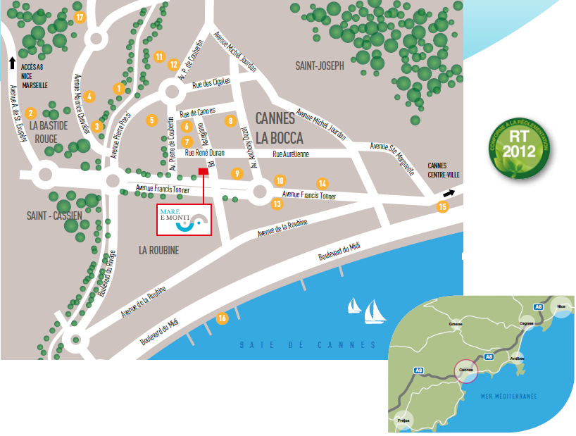 Les appartements à vendre dans la résidence Mare E Monti se situe à l'ouest de Cannes dans le quartier de la Bocca. L'environnement est urbain avec à proximité des villas, des programmes immobiliers neufs, au nord de l'autre côté de l'avenue DUNAN, un collège en cours de rénovation et à proximité d'une crèche récente en activité.