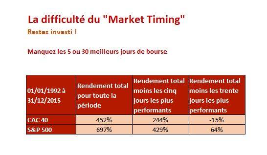 D'après le Market Timing, les rendements ont plus de chance de performer lorsque l’on laisse son argent investi.