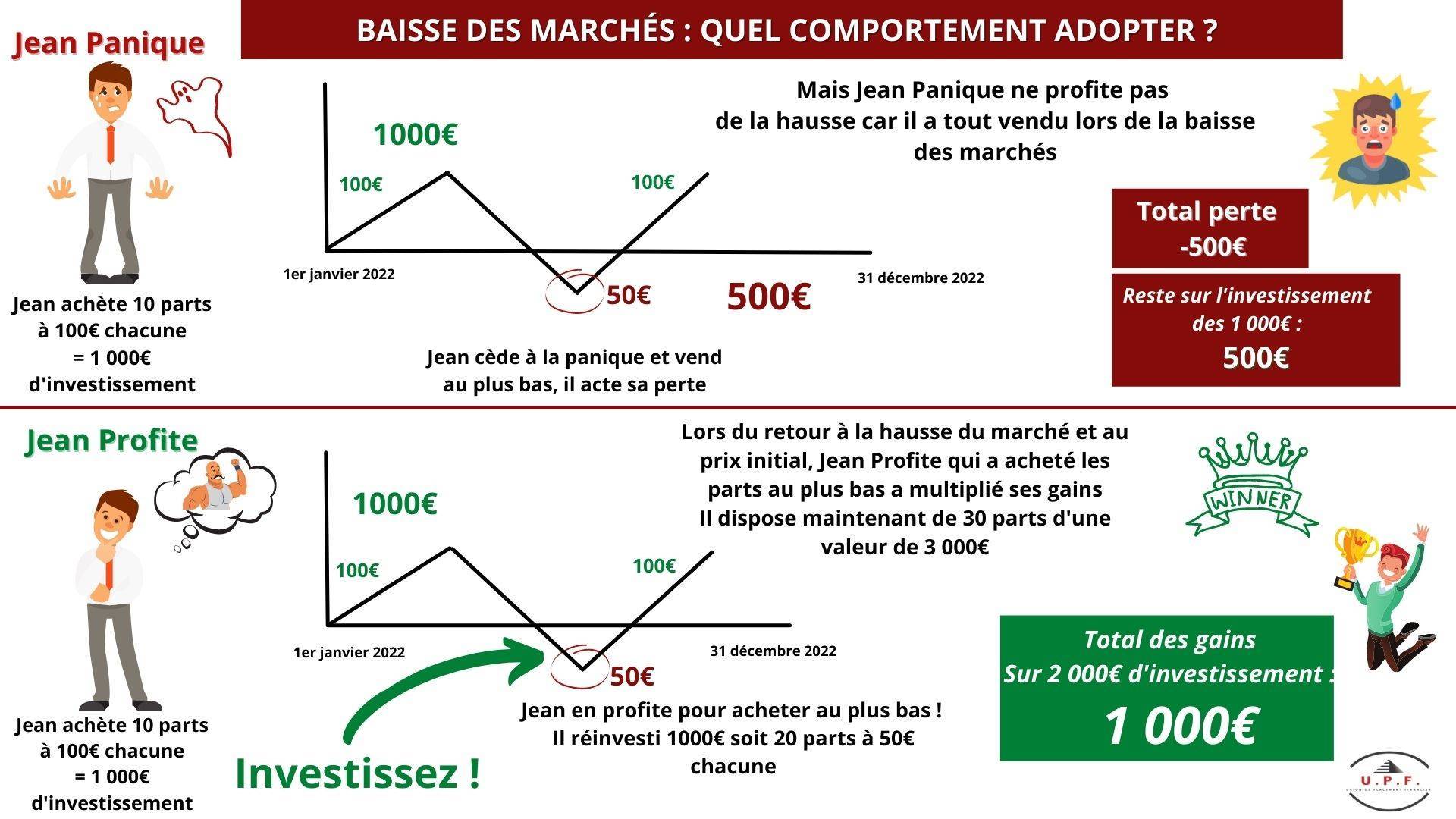 Lors d’une période de baisse boursière, certains investisseurs sont inquiets quant à leur portefeuille. Il ne faut pas céder à la panique et vendre ses positions car dans ce cas on vendrait à bas prix.