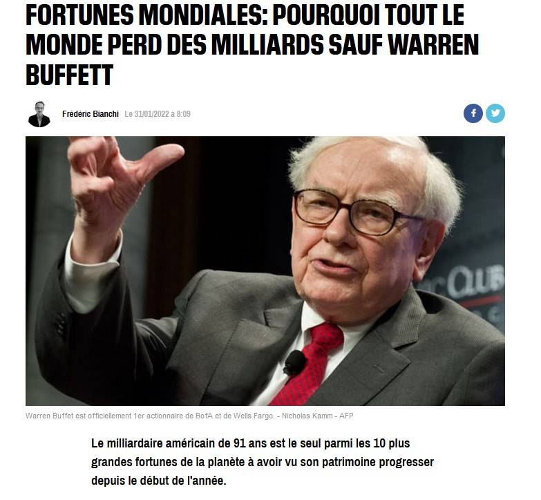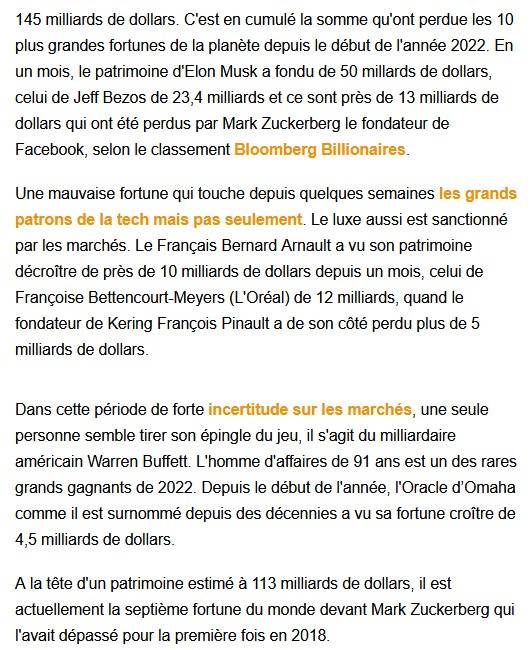 Alors qu'Elon Musk a vu son patrimoine baissé de 50 milliards de dollars et celui de Jeff Bezos diminué de 23.4 milliards de dollars, celui de Warren Buffett, un milliardaire américain a augmenté de 4.5 milliards de dollars. Il est la seule personne dont le patrimoine a augmenté pendant cette période.