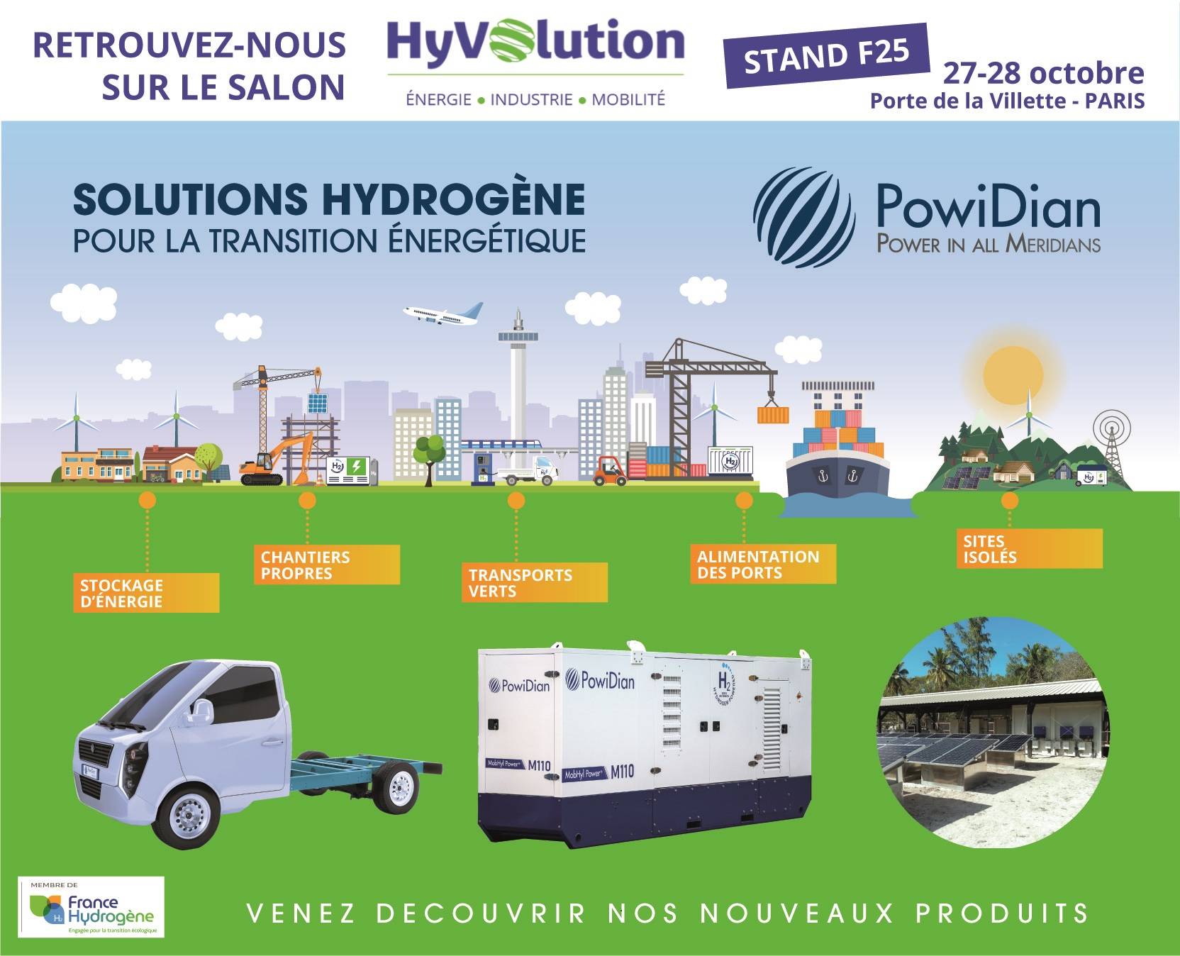 Greentech française de référence, PowiDian conçoit, fabrique, déploie et maintien des solutions d’électromobilité verte et durable via sa filiale PowiDian Mobility et des solutions de distribution d’énergie décarbonée via ses activités dédiées aux groupes électrogènes à hydrogène stationnaires ou mobiles.