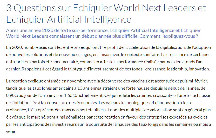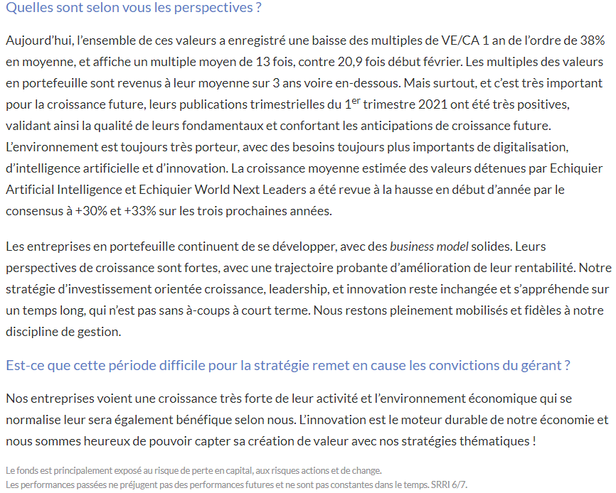 D’après la société, les fonds World Next Leaders et Echiquier Artificial Intelligence, restent des fonds très intéressants sur le marché.