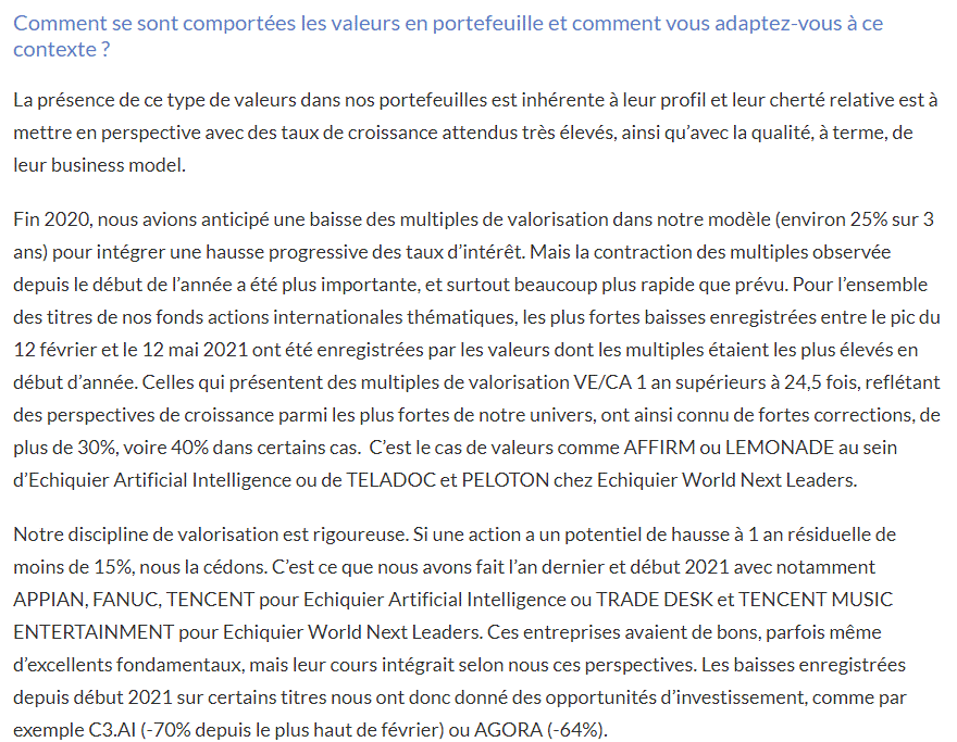 Aujourd'hui, l'ensemble de ces valeurs a enregistré une baisse des multiples de VE/CA 1 an de l'ordre de 38% en moyenne et affiche un multiple moyen de 13 fois, contre 20,9 fois début février. Les multiples des valeurs en portefeuille sont revenus à leur moyenne sur 3 ans voire en-dessous. Mais surtout, et c'est très important pour la croissance future, leurs publications trimestrielles du 1er trimestre 2021 ont été très positives, validant ainsi la qualité de leurs fondamentaux et confortant les anticipations de croissance future.