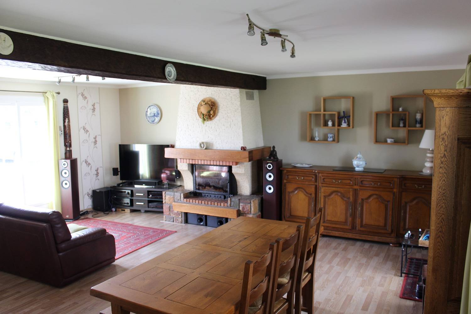 Un hall d'entrée desservant un séjour-salon avec cheminée et insert, une cuisine aménagée et équipée, une pièce technique, un placard et un wc.