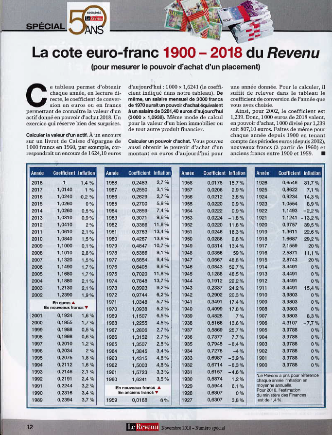 - la cote euro-franc 1900-2018 du Revenu;